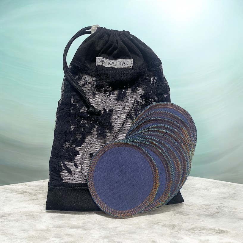 10 stycken biå trikåpads i en svart tvättpåse. Bara att tvätta och använda om och om igen istället för att använda engångs som du slänger. Både påsen och padsen kan tvättas i 60 grader och torktumlas.