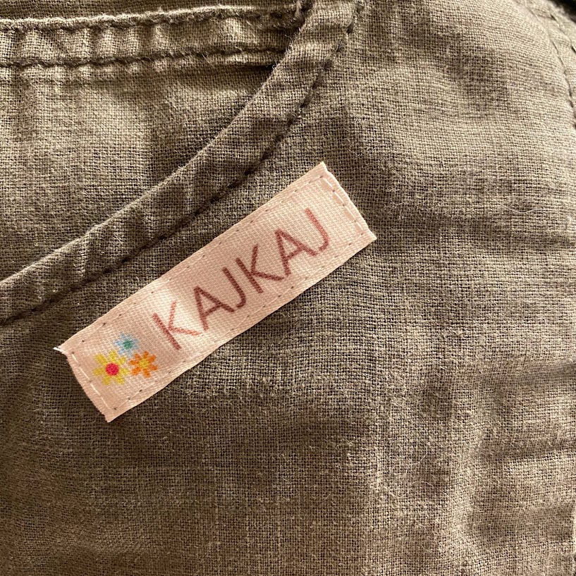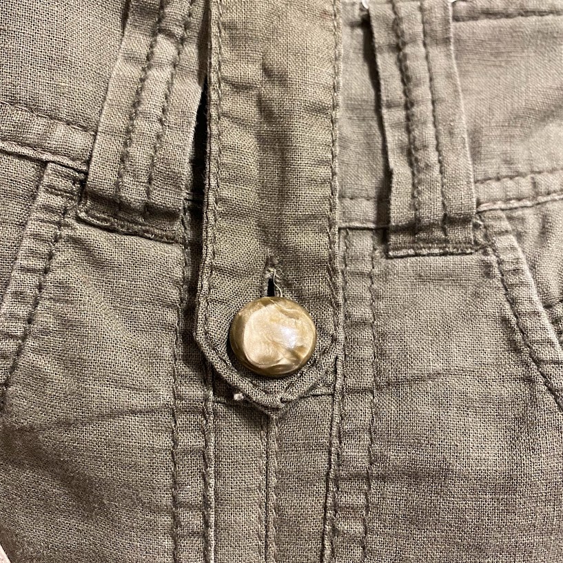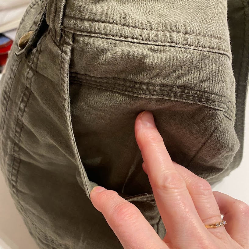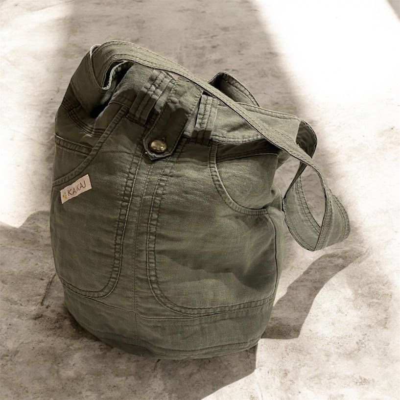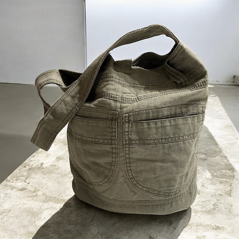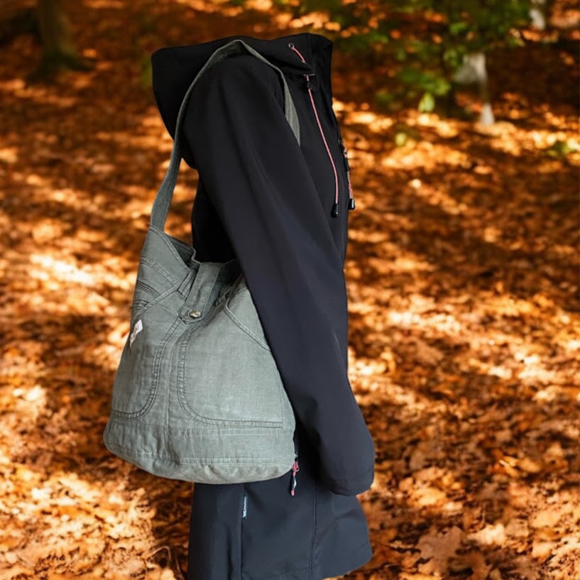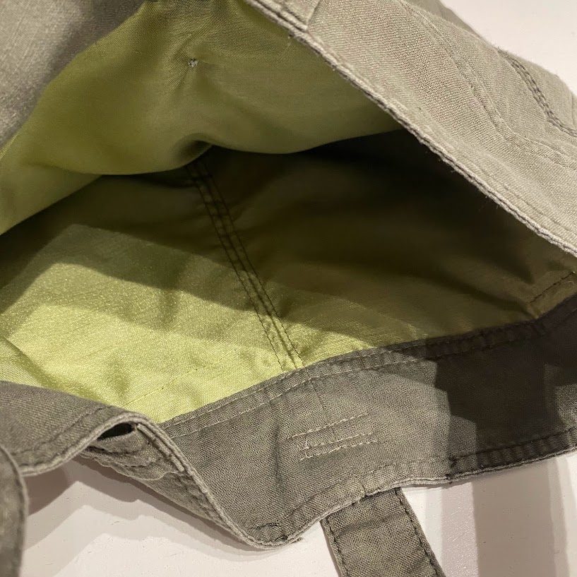 Militärgrön axelväska sydd av överdelen på ett par byxor där fickorna är bevarade och kan användas som fickor även nu. Botten är oval och väskan är fodrad med ett grönt blankt tyg. Den knäpps med en käppslå och knapp framtill. Väskan har ett mellanfoder men är ändå mjuk och kan inte stå upp av sig själv.