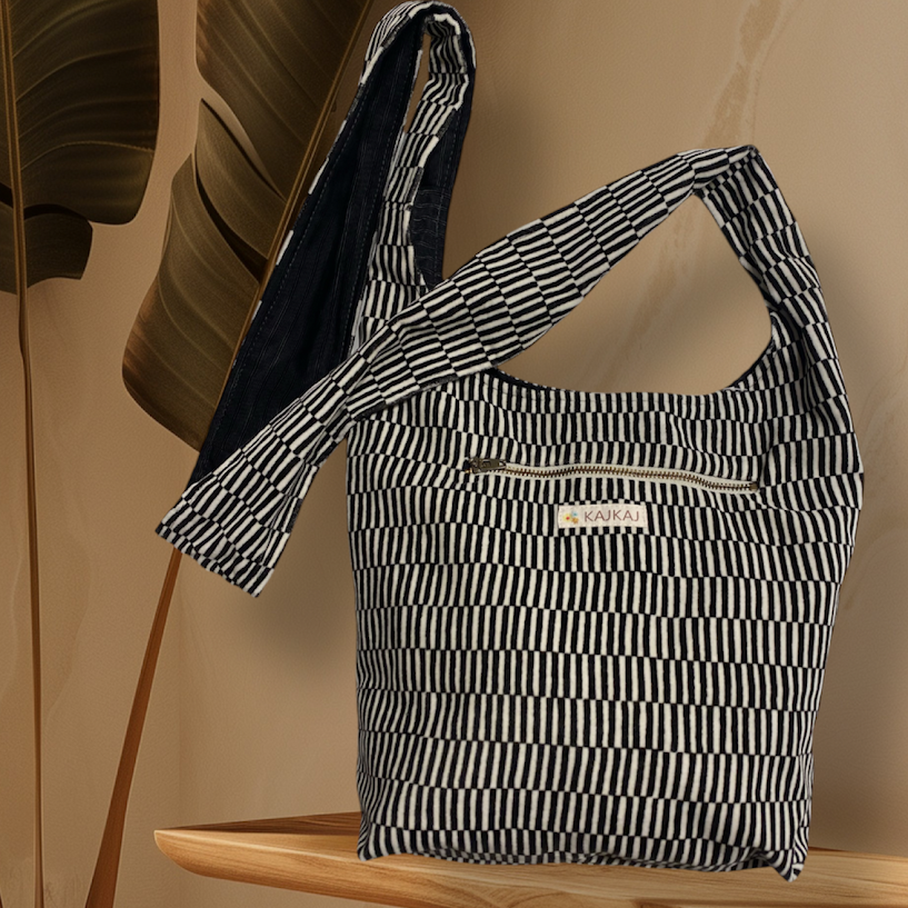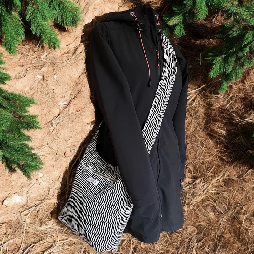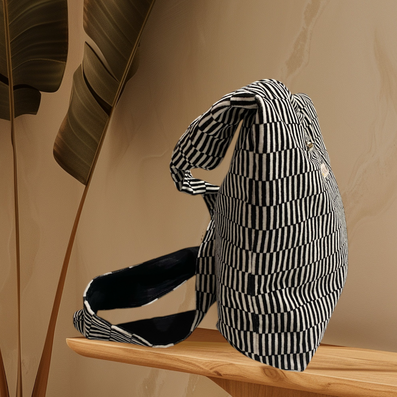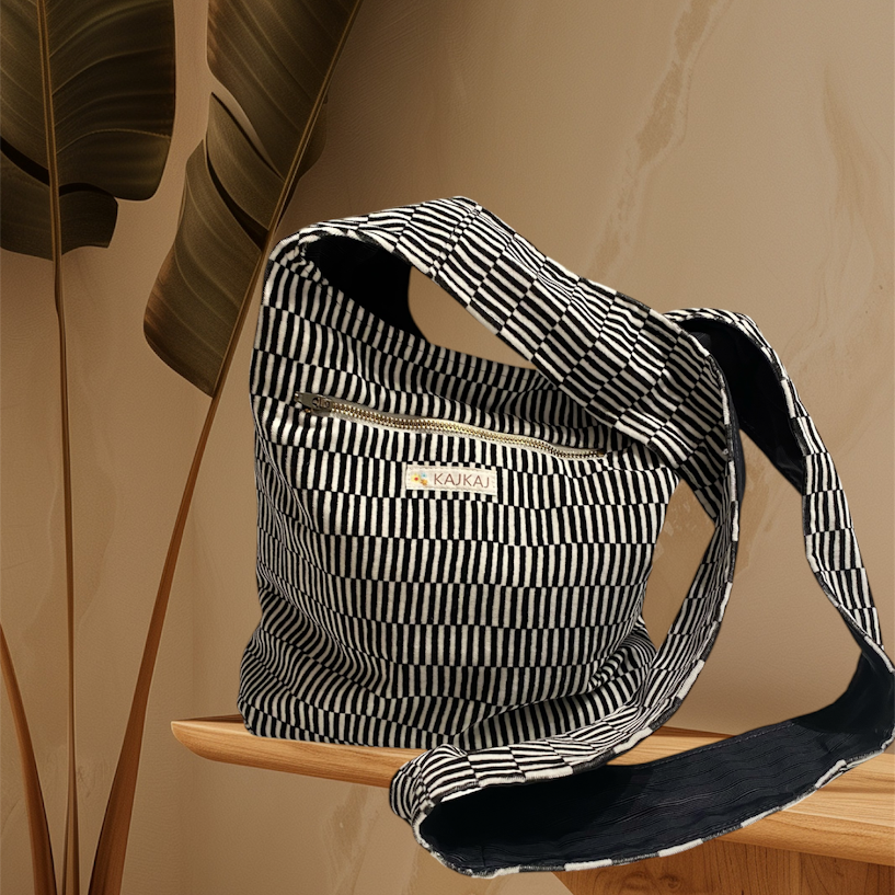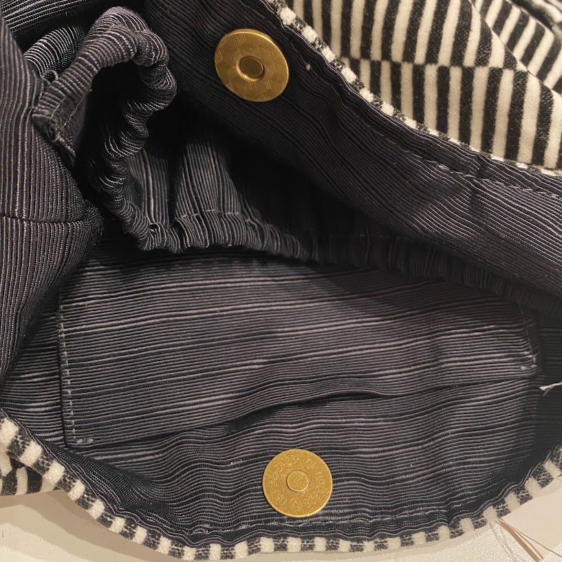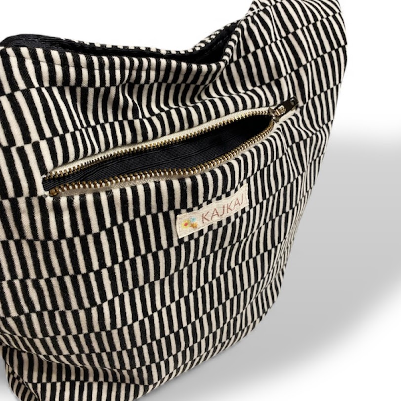 Axelväska i bomullssammet brun och beige. Fodrad i ett svart tyg och med två innerfickor, varav den ena med resår upptill. Även en dragkedjeficka på framsidan av väskan. Väskan stängs med en tryckknapp och är mjuk och skön att bära med det breda axelbandet.