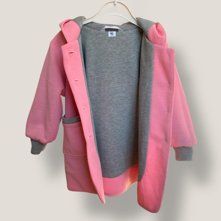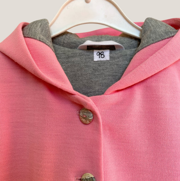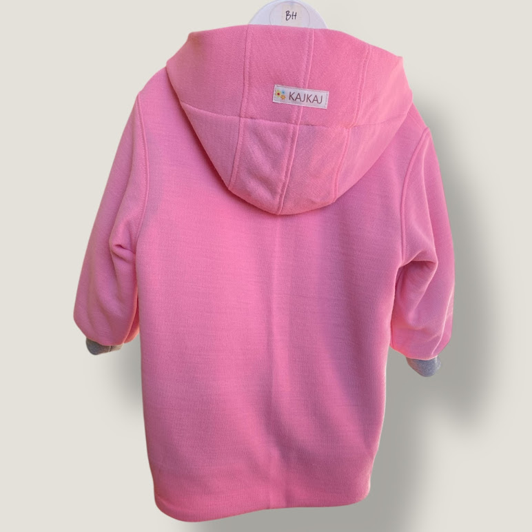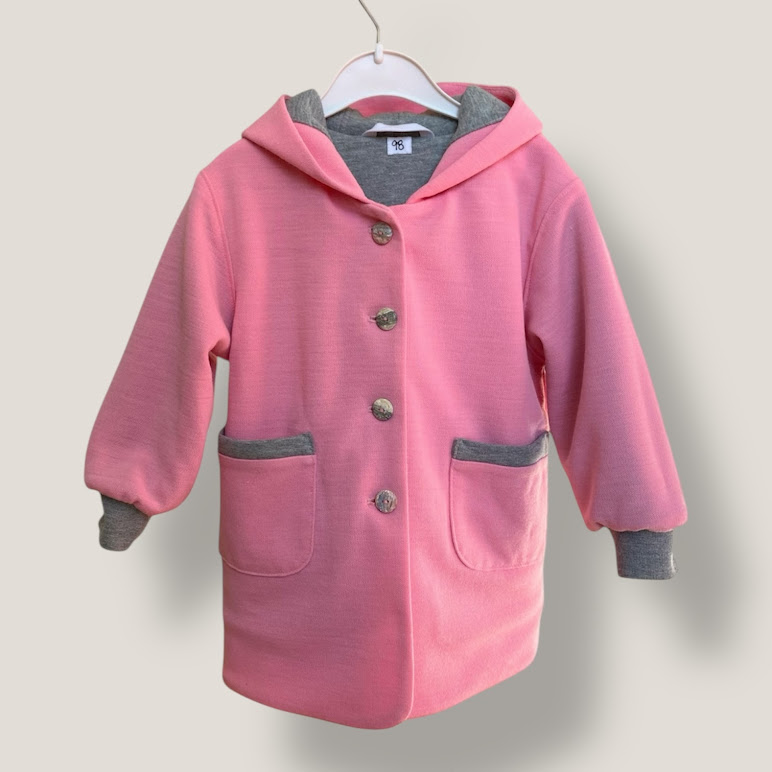 En mjuk och skön jacka eller kappa. Yttertyg i rosa ullpiké och fodrad med ett grått joggingtyg med flossad baksida. Muddar i ärmslut, fickor fram och en stor härlig luva. Jackan känns som en fodrad tröja med sitt mjuka material.