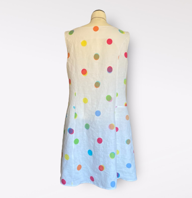 Ärmlös linneklänning i vitt med prickar i olika färger. Prinsesskärning både fram och bak och fickor i sidorna. Figursydd med lite insvängd midja och mycket vidd nertill.