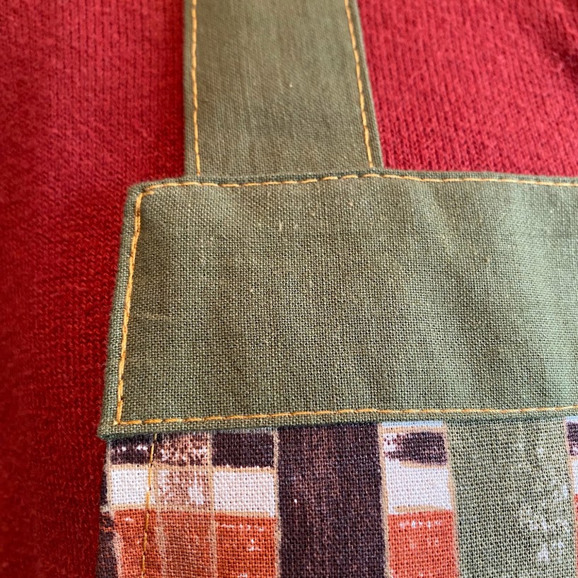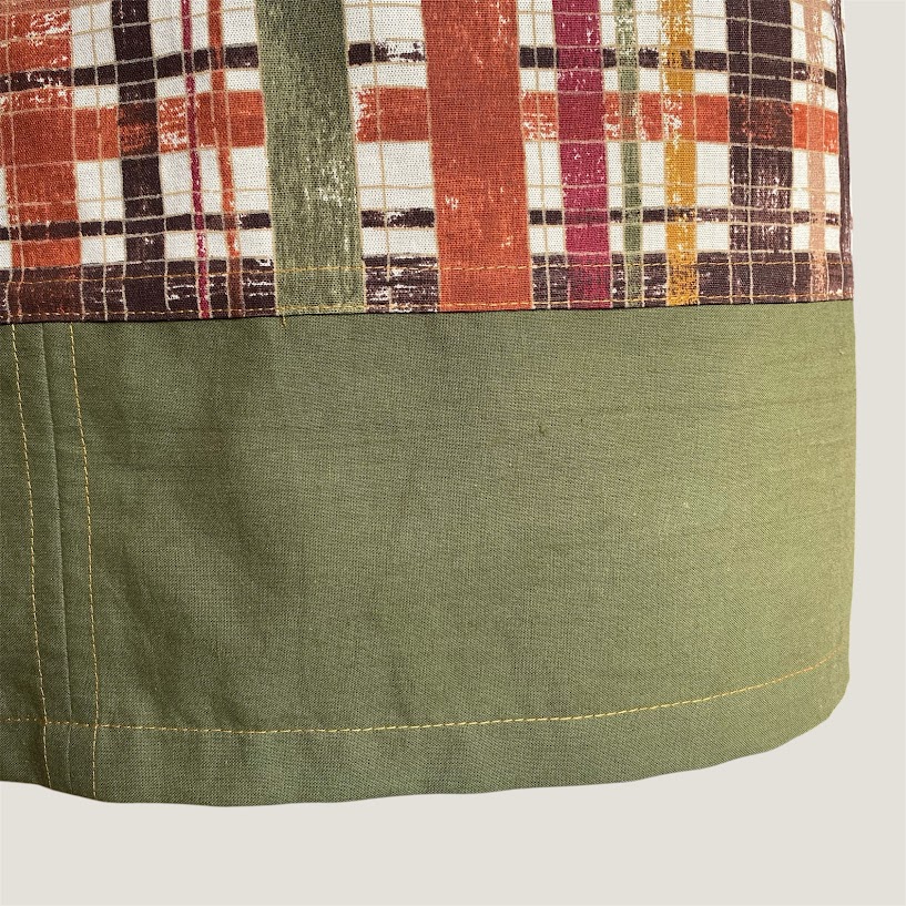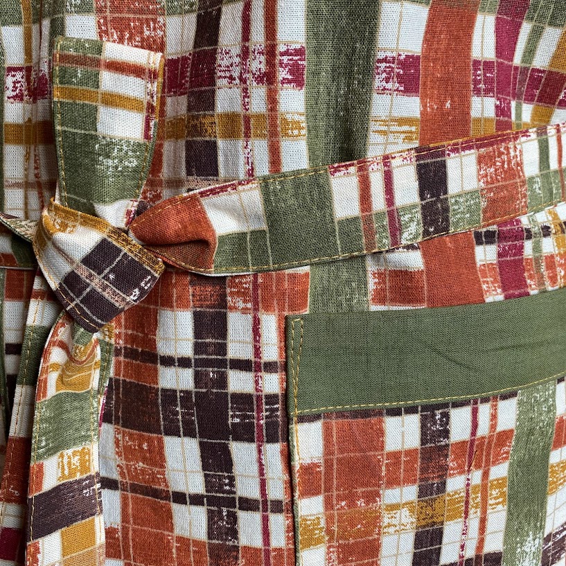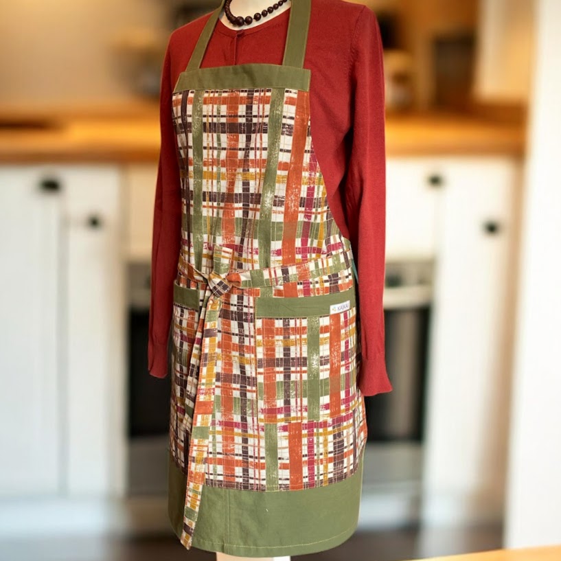 Förkläde sytt av bomullstyger med långt knytband så att du kan knyta fram på magen.