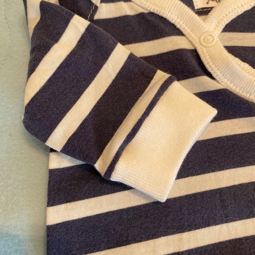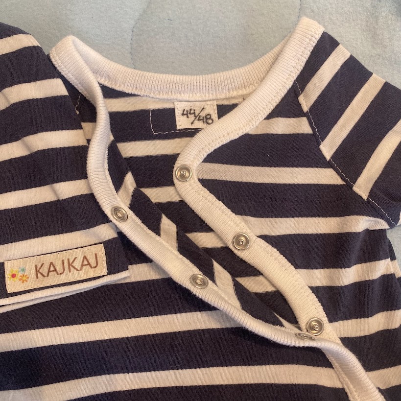 Marinblå- och vitrandig onepiece i bomullstrikå och med tryckknappar hela vägen ner till benmudden vilket gör den lätt att ta av och på. Mössan är fodrad.