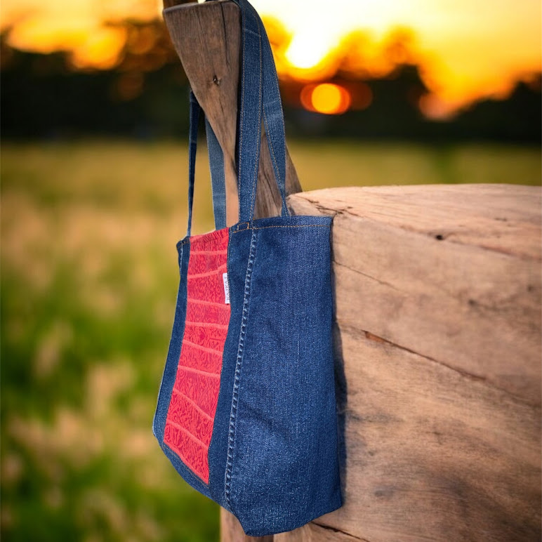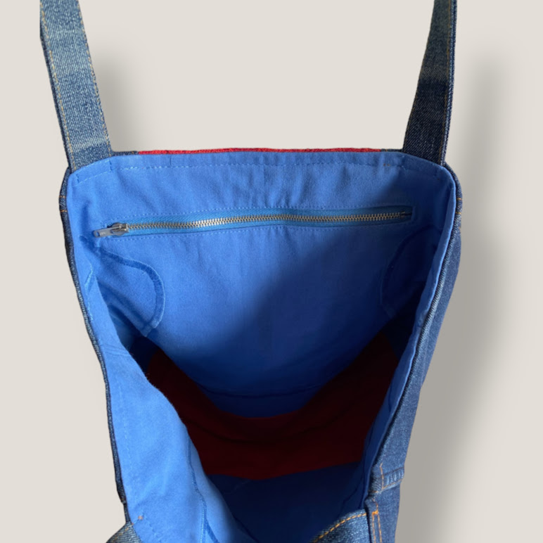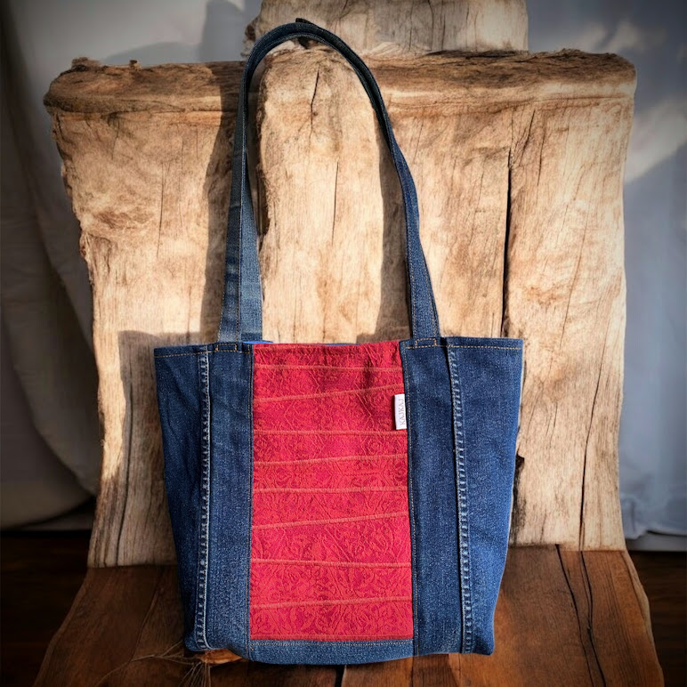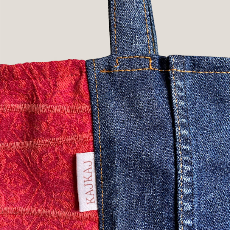Tygkasse i jeanstyg och rött grövre mönstrat tyg. Fodrad med innerficka som har dragkedja. Axellånga remmar.