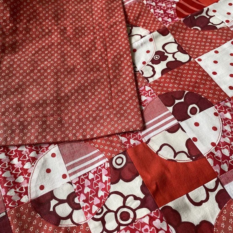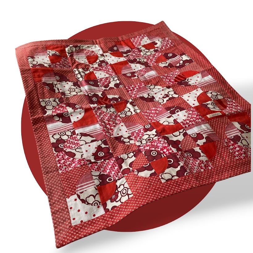 Lapptäcke i bomull och mellanfoder av flanell, rött och vitt.