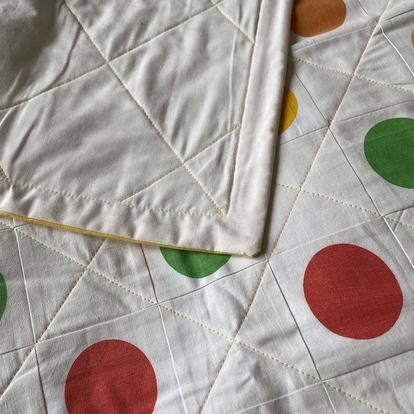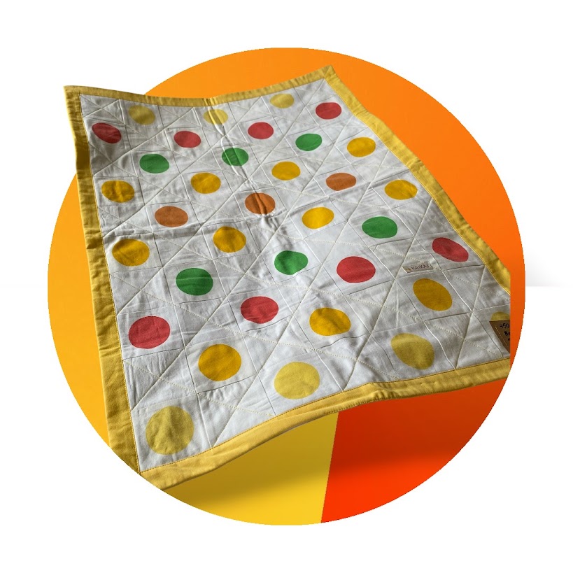 Lapptäcke i bomull och ett tyg av stretchfrotté som mellanfoder. Vitt med gula, röda och gröna prickar.