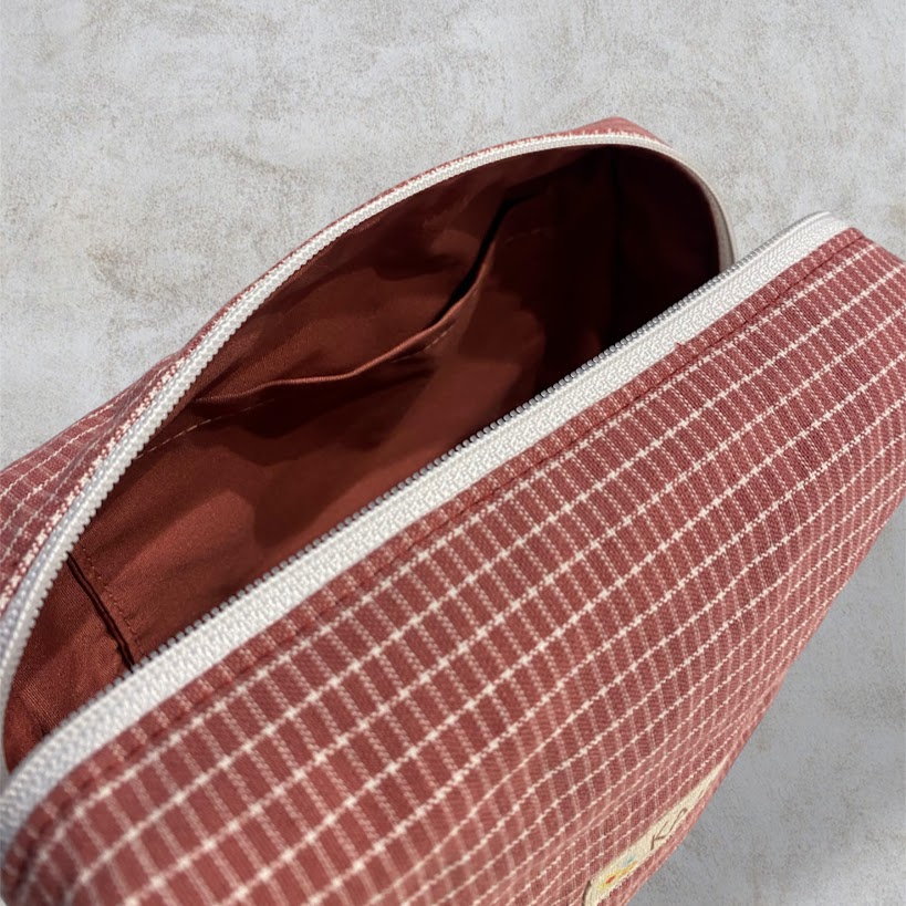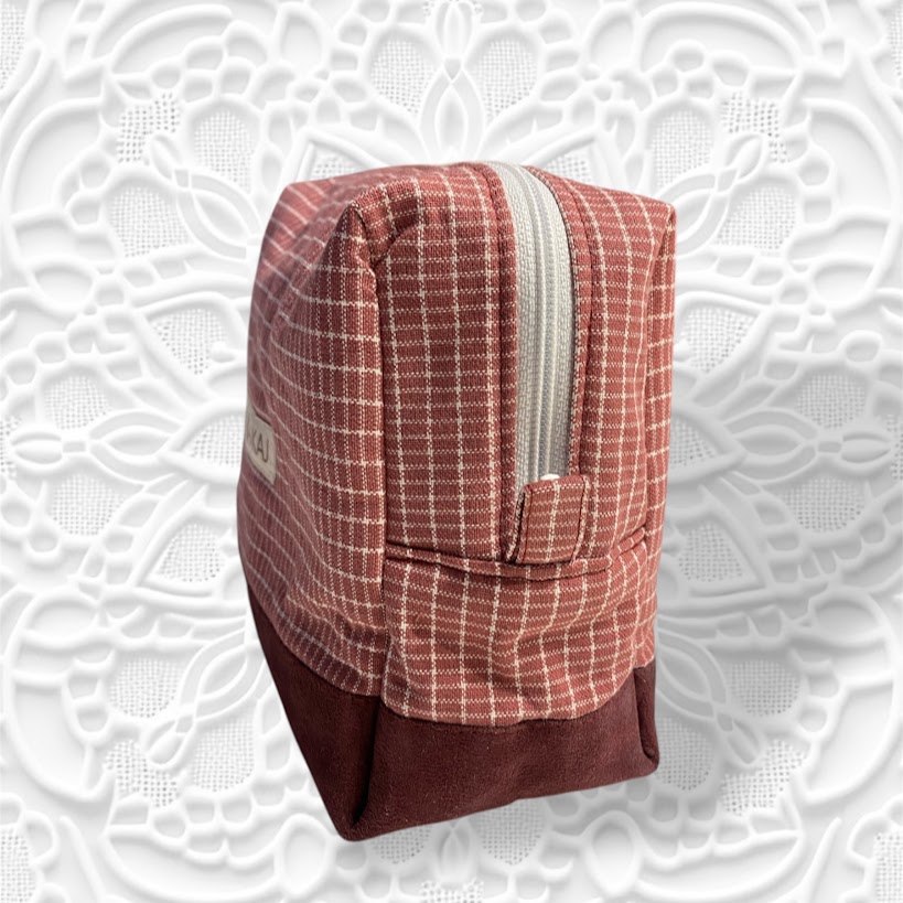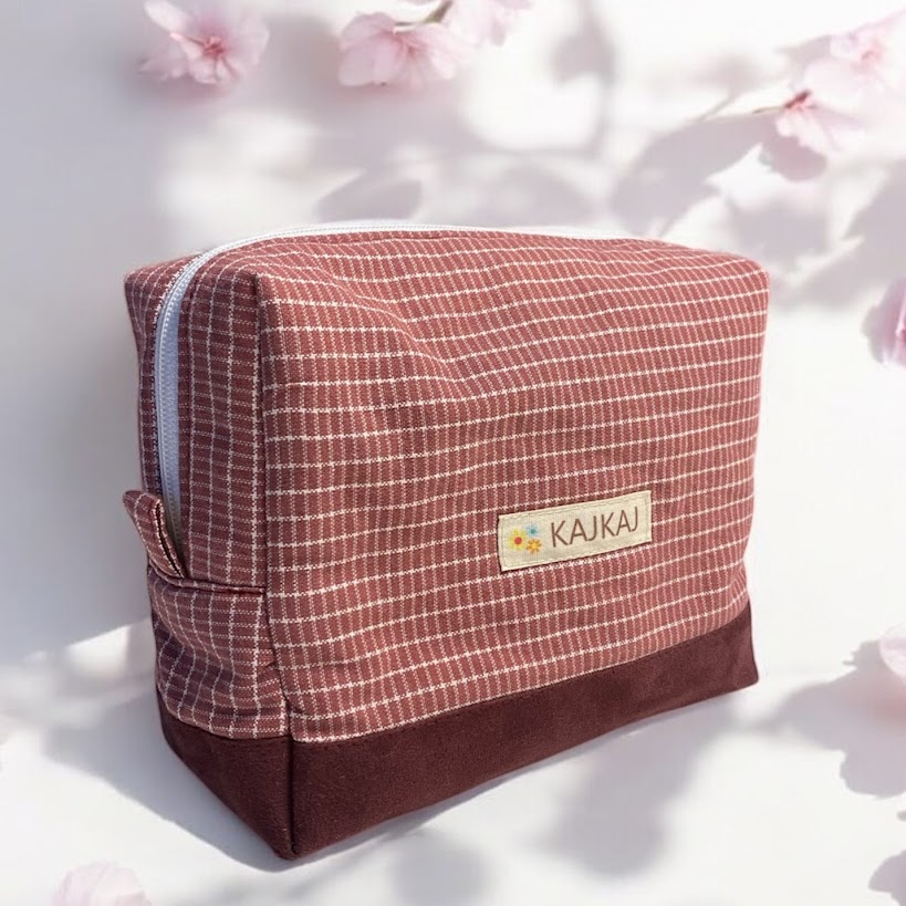 Necessär i hallonrött och vitt bomullstyg botten i vinröd fuskmocka. Den har en innerficka och är sydd med ett vadderat mellanfoder så att den har lite stadga, men är ändå mjuk.