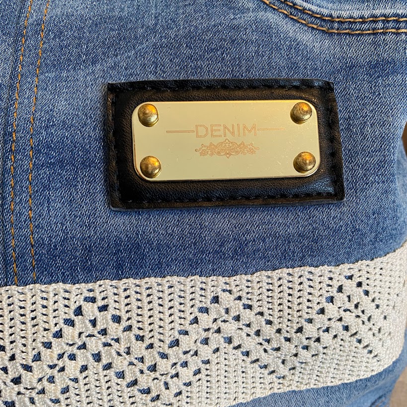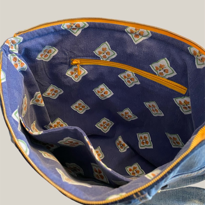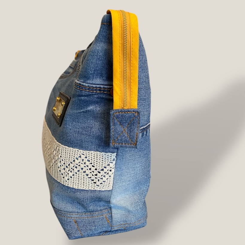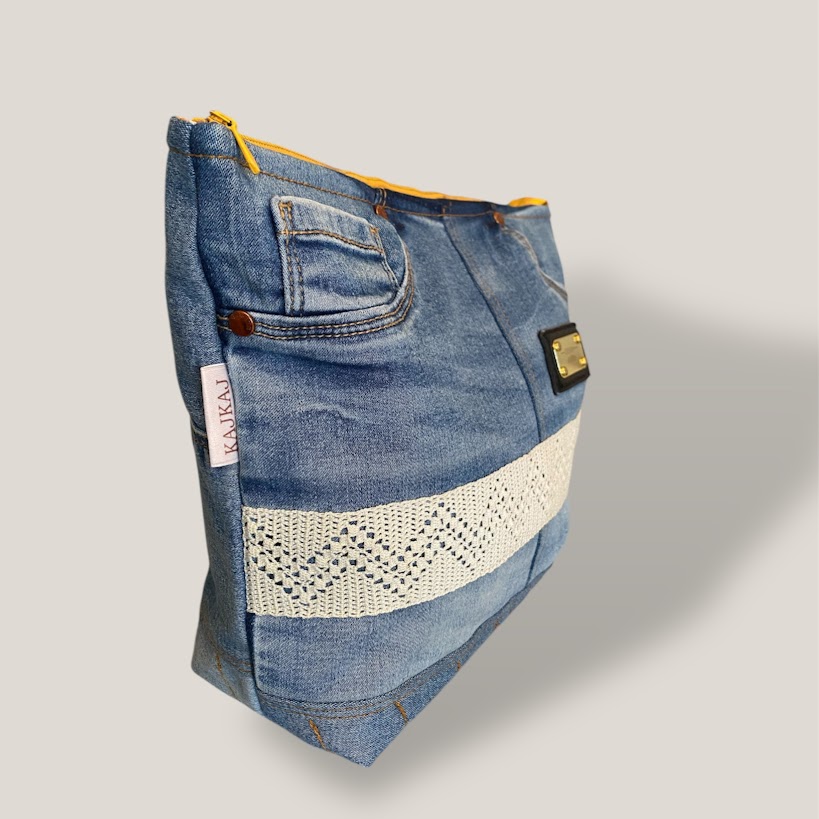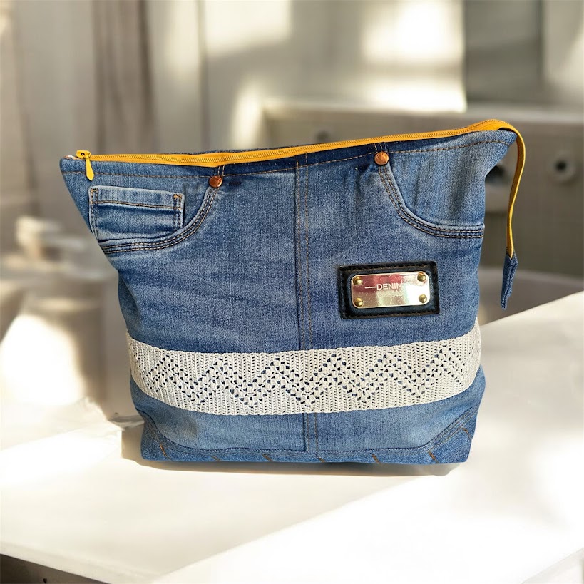 Jeansnecessär sydd av delar från ett par jeans. På baksidan finns en bakficka som går att använda. Fickorna på framsidan är igensydda. Den är fodrad och har två innerfickor varav den ena med dragkedja. Dekorerad med ett handvirkat bomullsband. Den är sydd så att öppningen blir "öppen och vid" vilket gör att det lätt går att hitta saker i den. En mycket välarbetad och originell necessär.