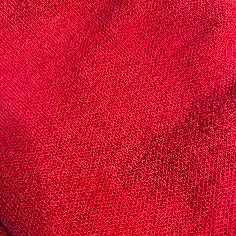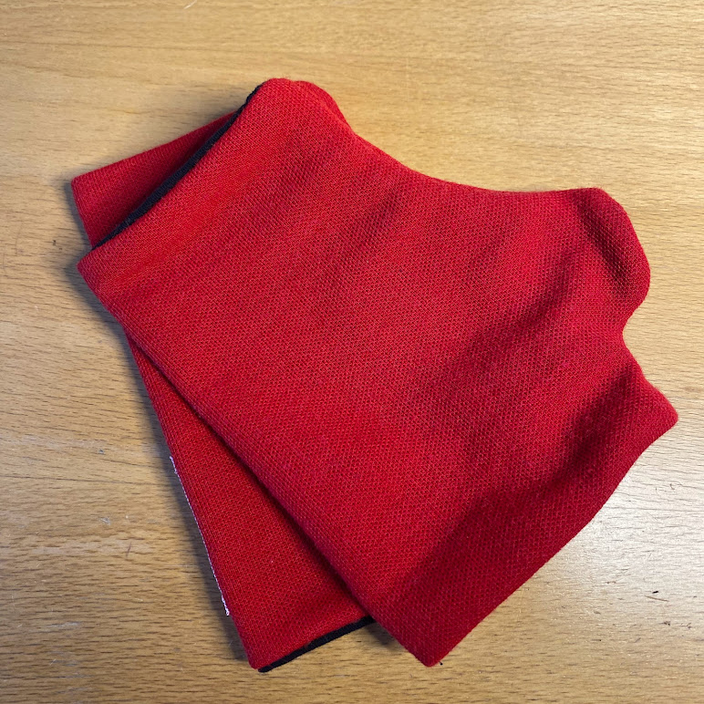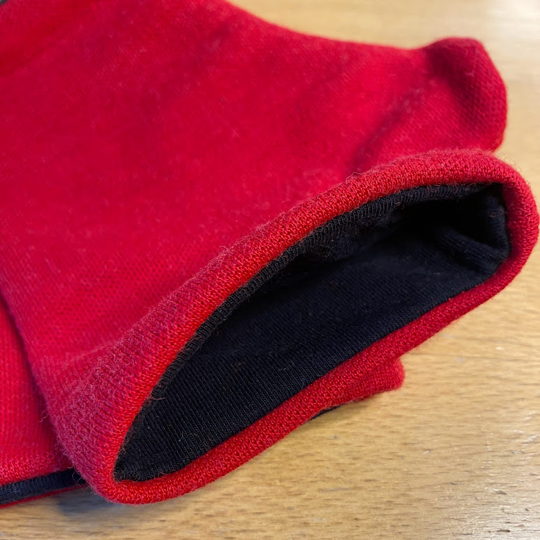 Röda handledsvärmare/torgvantar sydda i ullpiké och fodrade med bomullstrikå i svart.