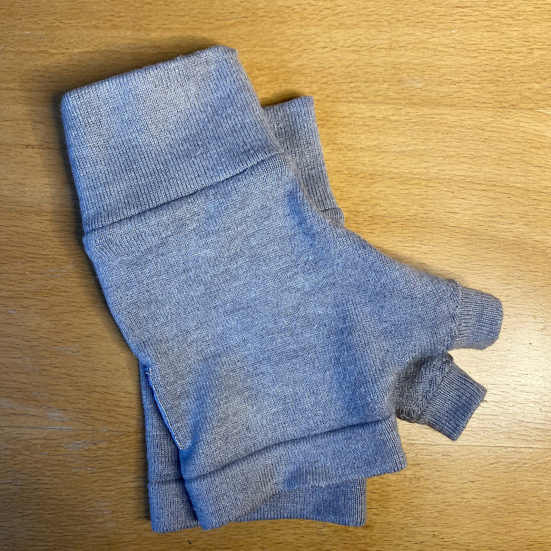 Tunna grå handledsvärmare/torgvantar sydda i bomullstrikå.