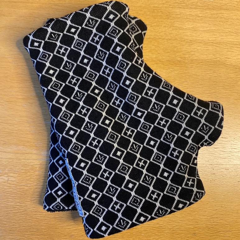 Svart/gråa handledsvärmare/torgvantar sydda i trikå (något brandmaterial) och fodrade med svart fleece.