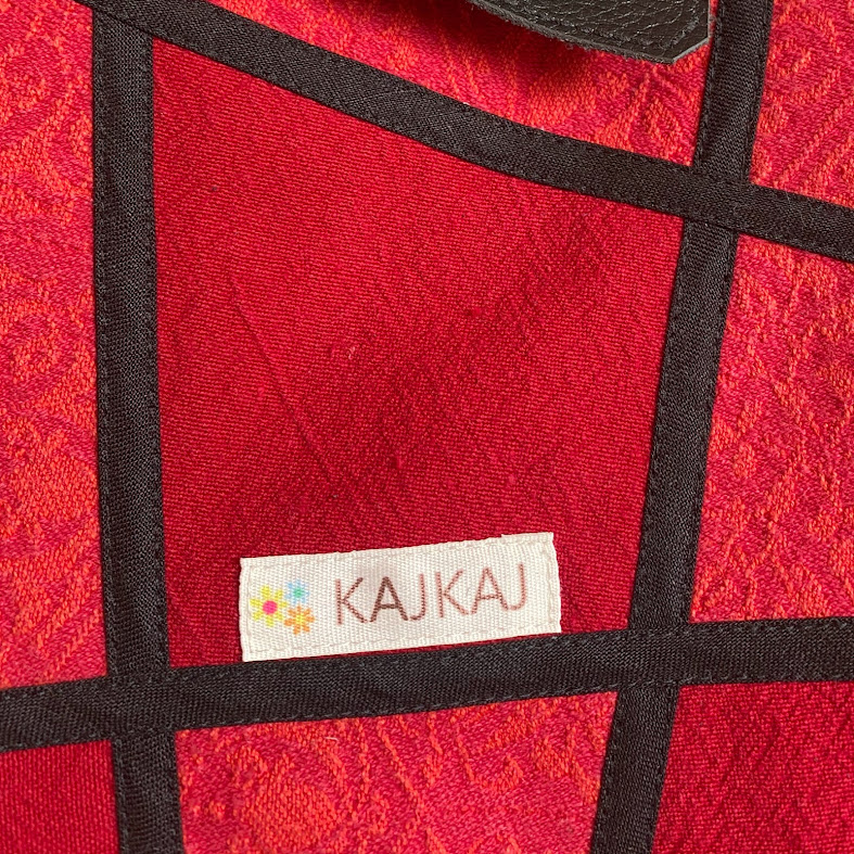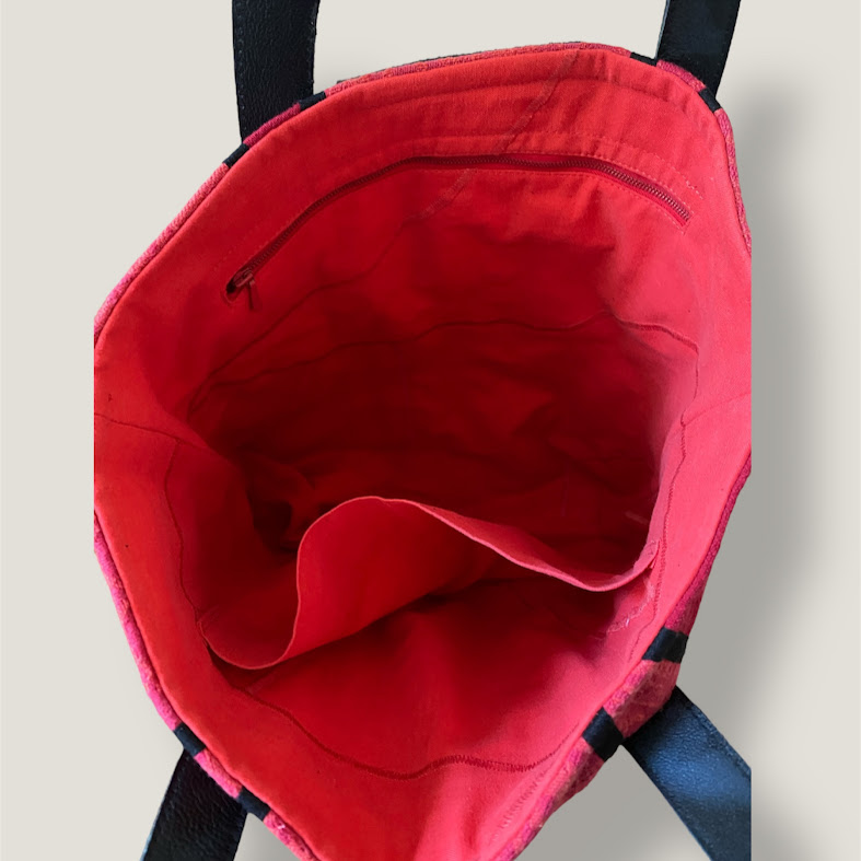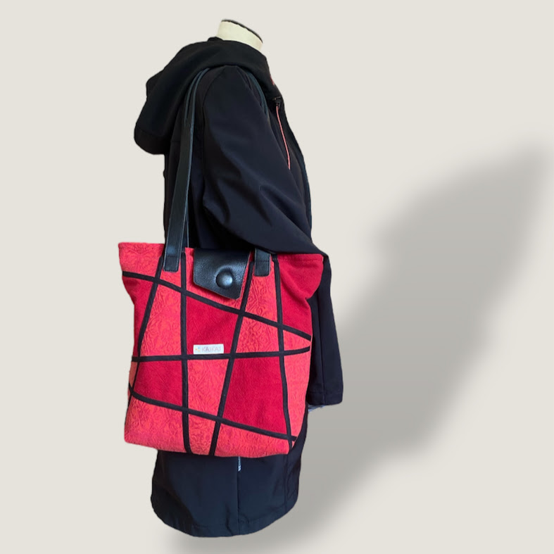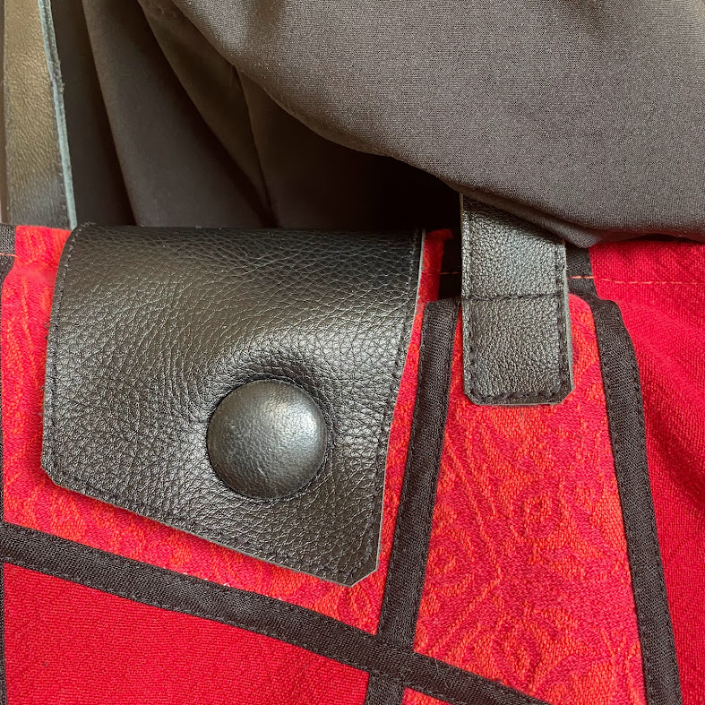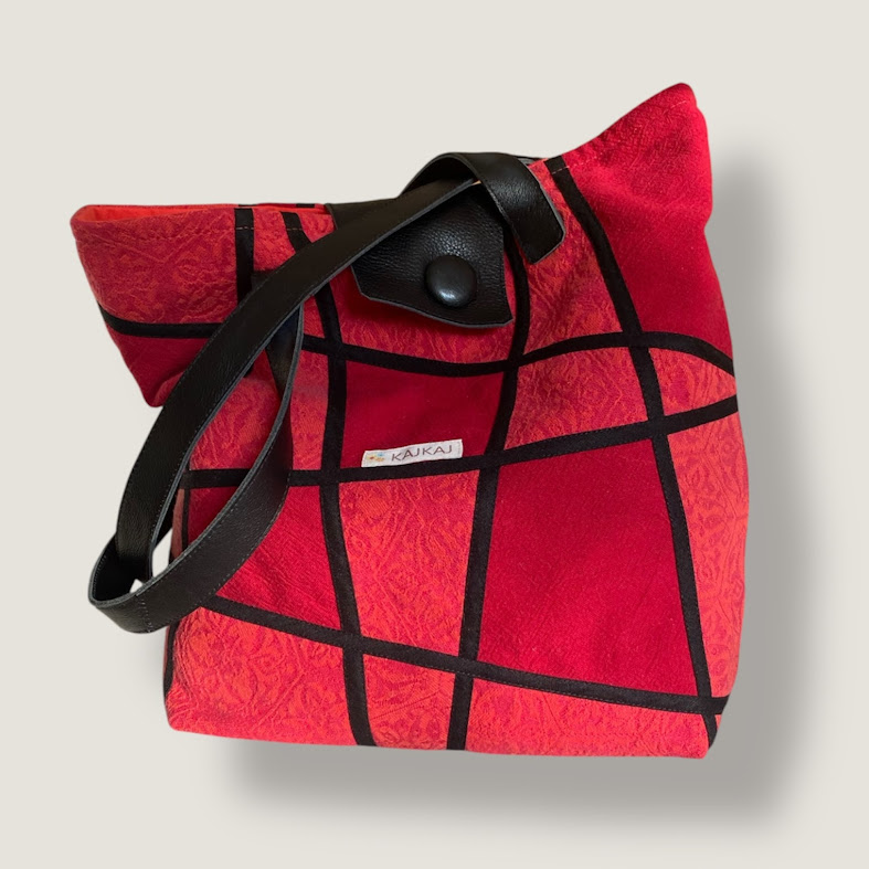 Axelväska sydd i lapptekning i röda färger med svarta detaljer. Axelrem och knäppslå är i svart skinn och den är fodrad med ljusrött tyg med två