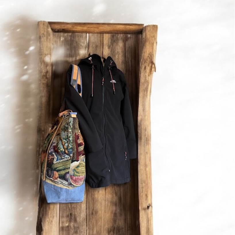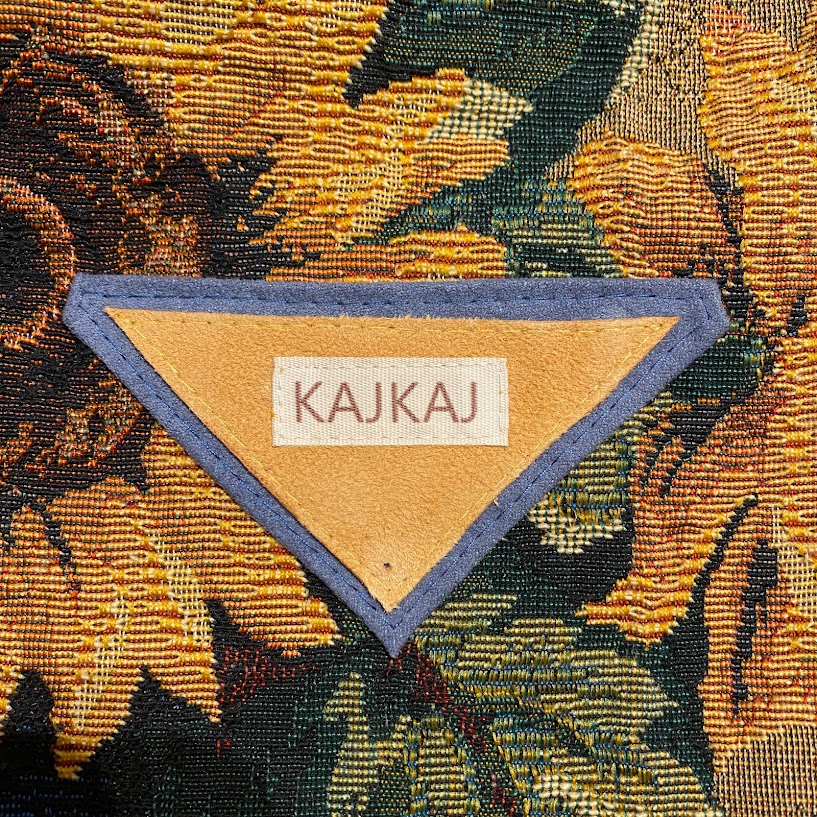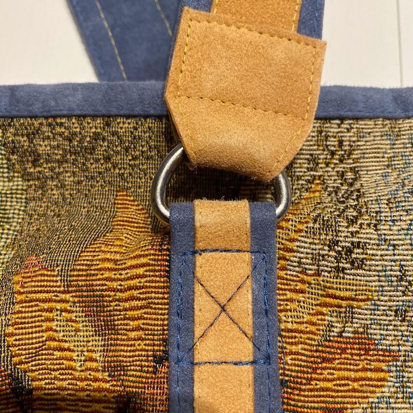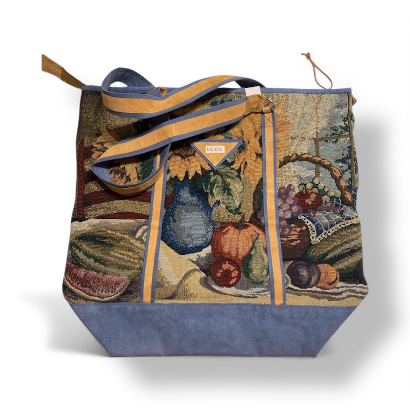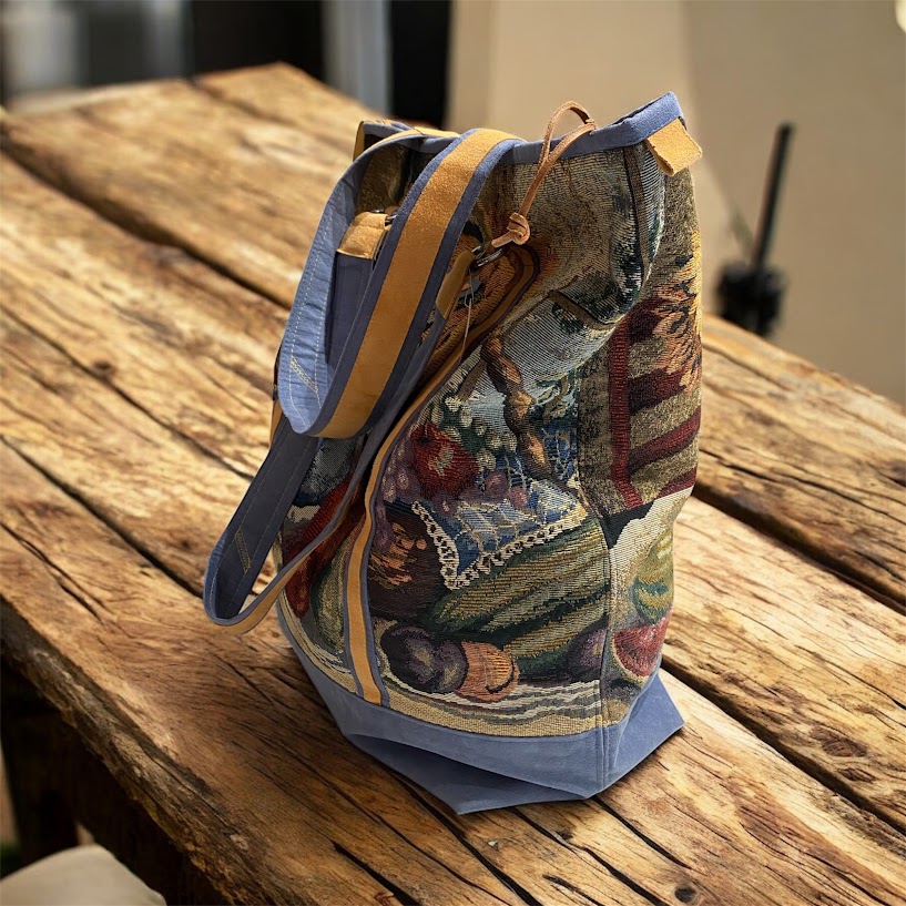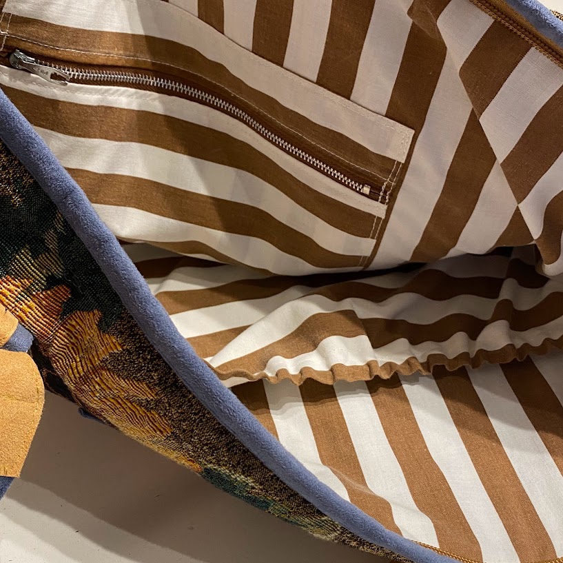 Bag eller shoppinväska i gobelängtyg och blåt fuskmocka. Har ett