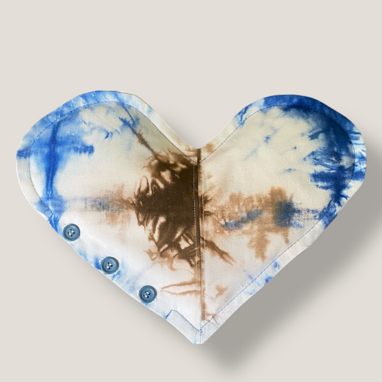 Vetehjärta sytt av återbrukat tyg och fyllt med krav- och närodlat vete. Överdraget går att öppna och ta av med tre knappar för att kunna tvättas. Perfekt storlek för att lägga på en mage med menssmärtor, men såklart kan man använda den var som helst på kroppen. Kall eller varm.