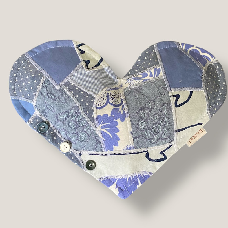 Vetehjärta sytt i lappteknik och fyllt med krav- och