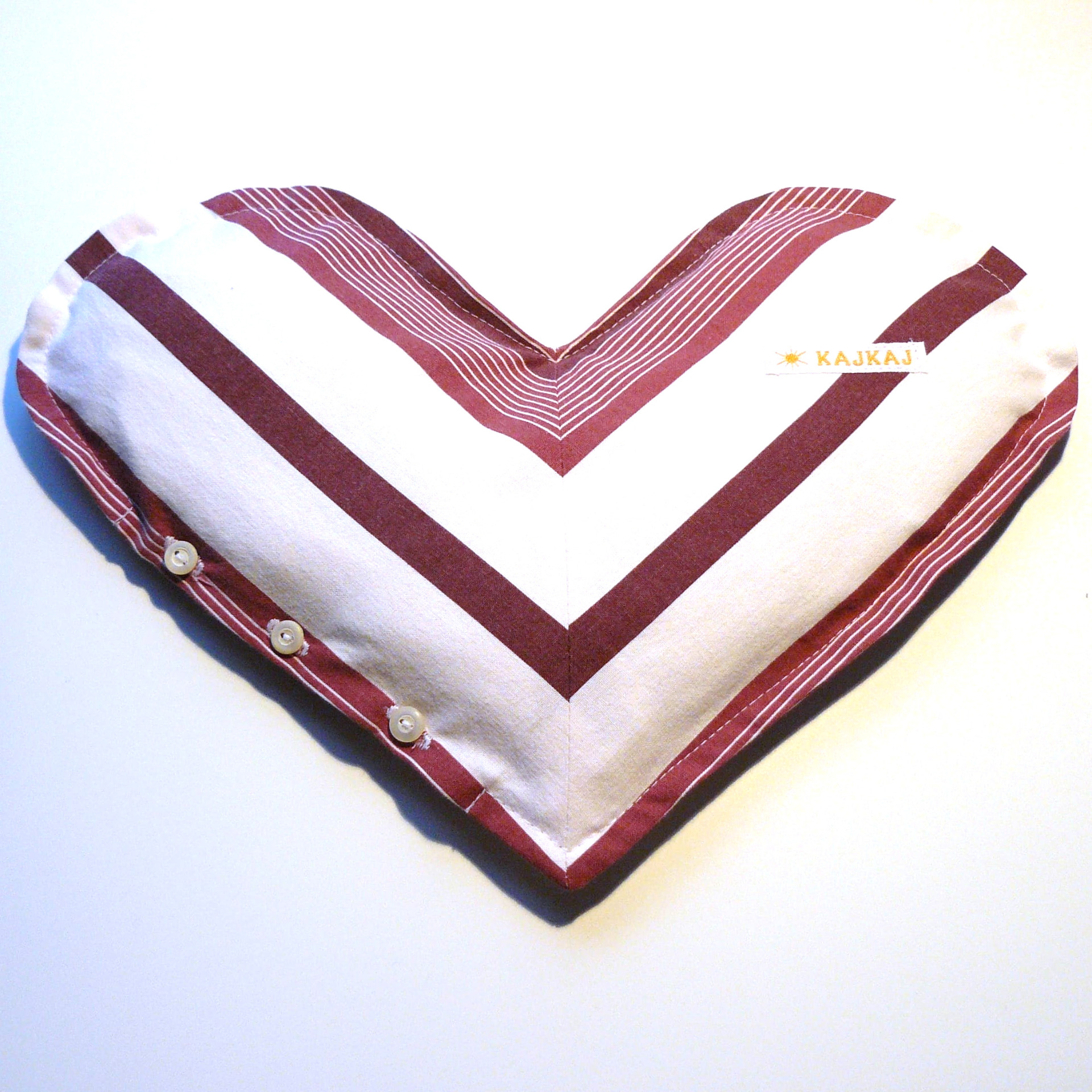Hallonrött och vitt vetehjärta sytt av återbrukat tyg och fyllt med krav- och